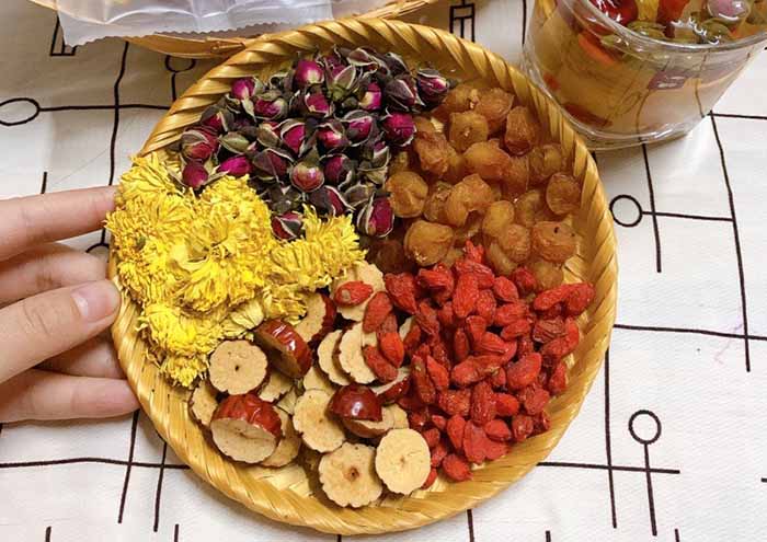- Kế đó cho nụ hoa hồng, táo lát, kỷ tử, long nhãn hưng yên vào.